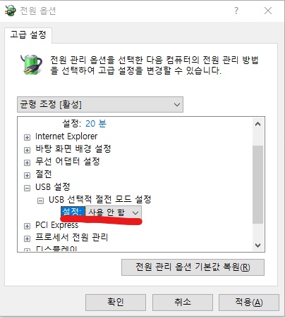 여기서 usb설정>usb 선택적 절전 모드 설정을 사용안함으로 해주시면 됩니다.