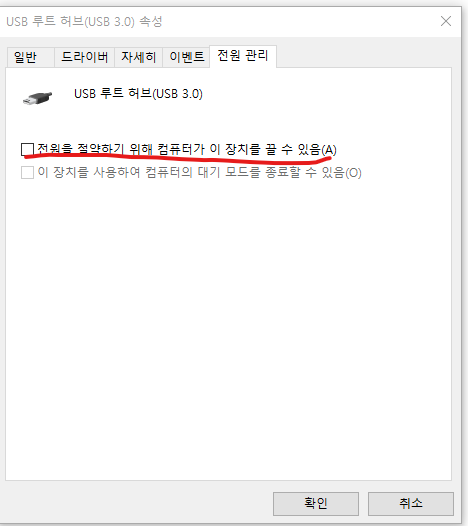 그래도 안되면 윈도우에서 usb전원관리부분의 설정을 변경해주시면 해결가능합니다!