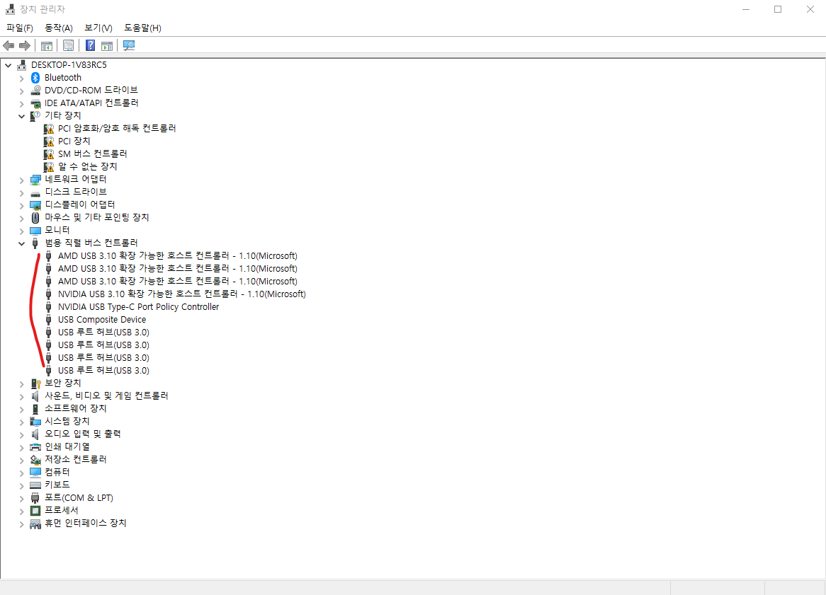 범용 직렬 버스 컨트롤러안에있는 항목을 마우스 오른쪽클릭하시면 속성이 나옵니다.