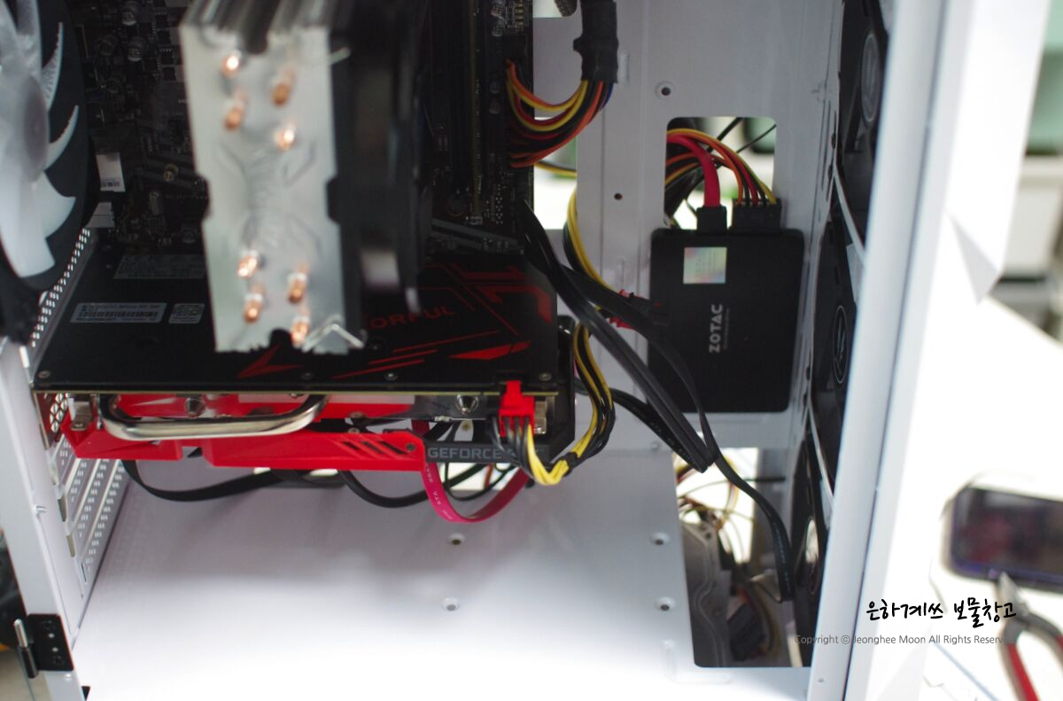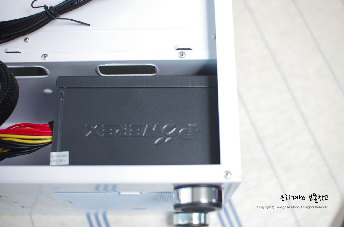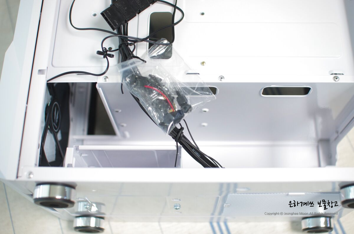 기존케이스는 파워가 윗부분에 있어서 선정리가 어려웠는데 아래쪽에 파티션이 나눠져있고, 메인보드쪽으로 선을 넣을수있는 케이블홀이 있어서 간단하게 선정리가 가능합니다.