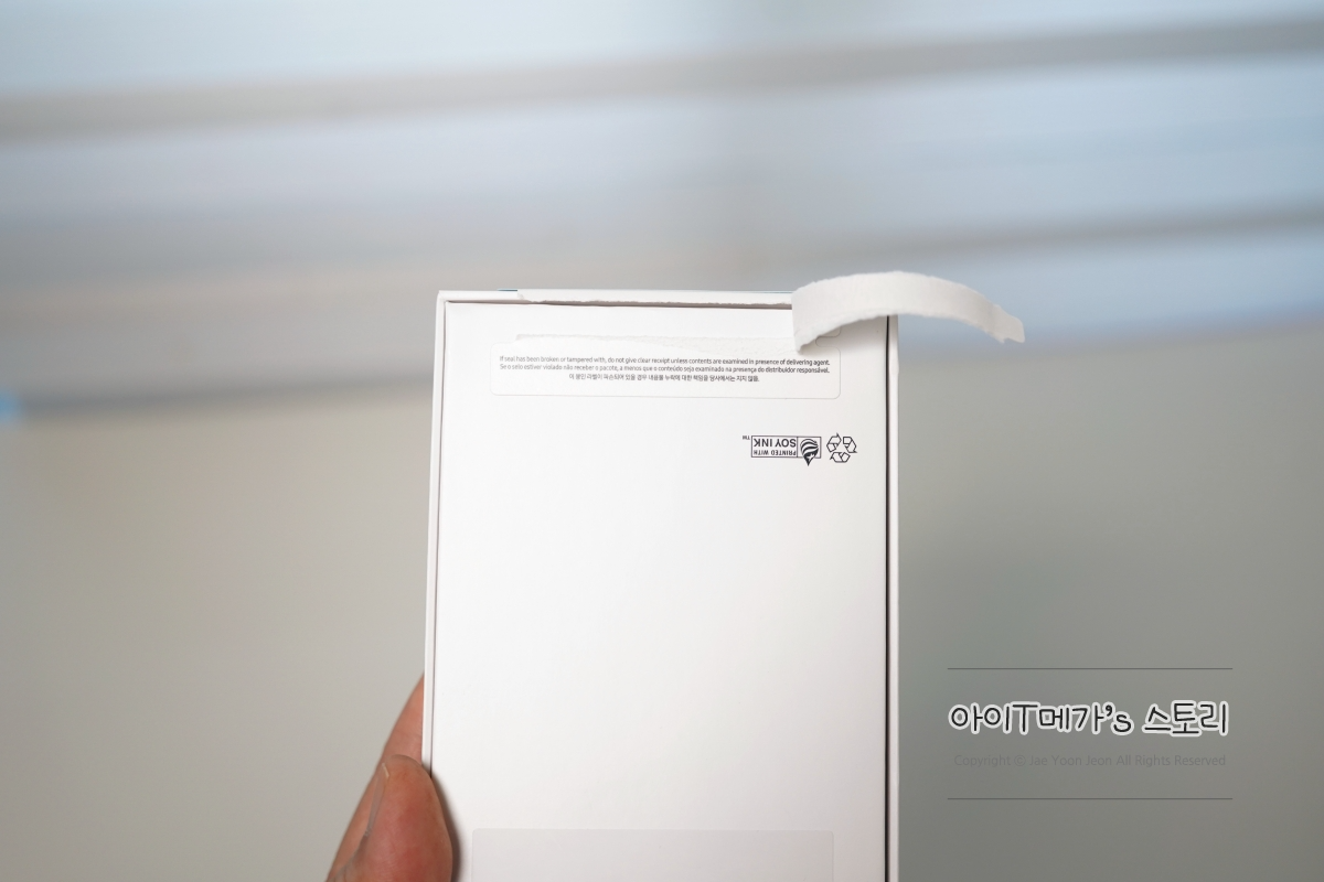 갤럭시 A35의 박스를 열기 전, 상단에 있는 봉인 스티커를 제거해 주세요.